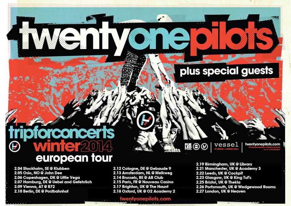 Vessel was made available to listen on December 18, 2012 through Entertainment Weekly. Vessel was soon officially released through their new label, Fueled by Ramen on January 8, 2013[7]. The first tour after being signed by Fueled by Ramen was the Mostly November Tour, starting October of 2012 and ending that same year [8]. 2014 saw the end of the group of concerts know as 'Trip for Concerts'[9] that had started in late 2011[10]. The first tour that started after the release of Vessel was the Quiet is Violent World Tour in September of 2014, ending later that year[11]. The Quiet is Violent World Tour was mainly to promote the new release of Vessel.